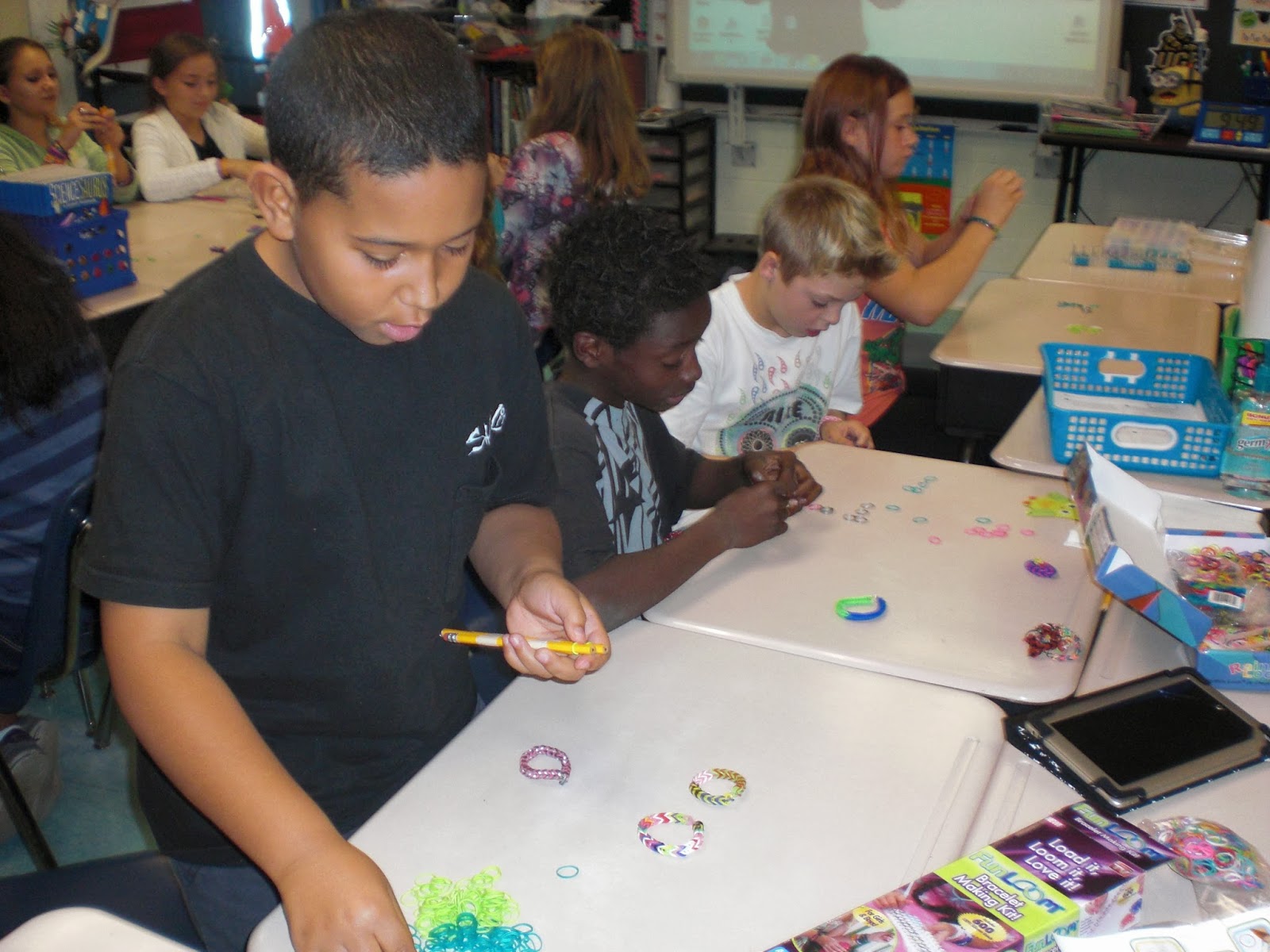 Today during ZONE Mrs. Peterson and I hosted the Rainbow Loom Bracelets room and we had a blast. The kids were taught how to make a fish tail bracelet. Even though we had a bunch of bracelet experts there were several students who learned something new. We had bracelets with patterns, solid colors and a rainbow pattern. Thanks to Mrs. Peterson and Ms. Butler for picking up the supplies.